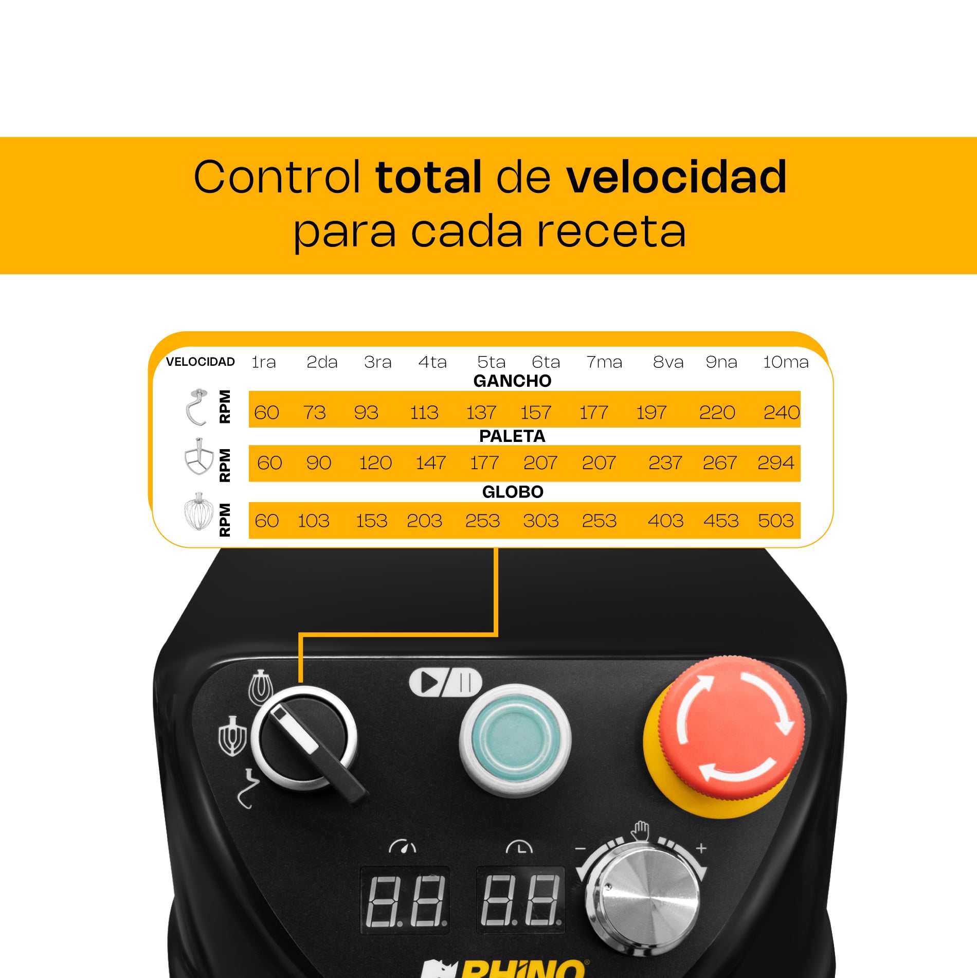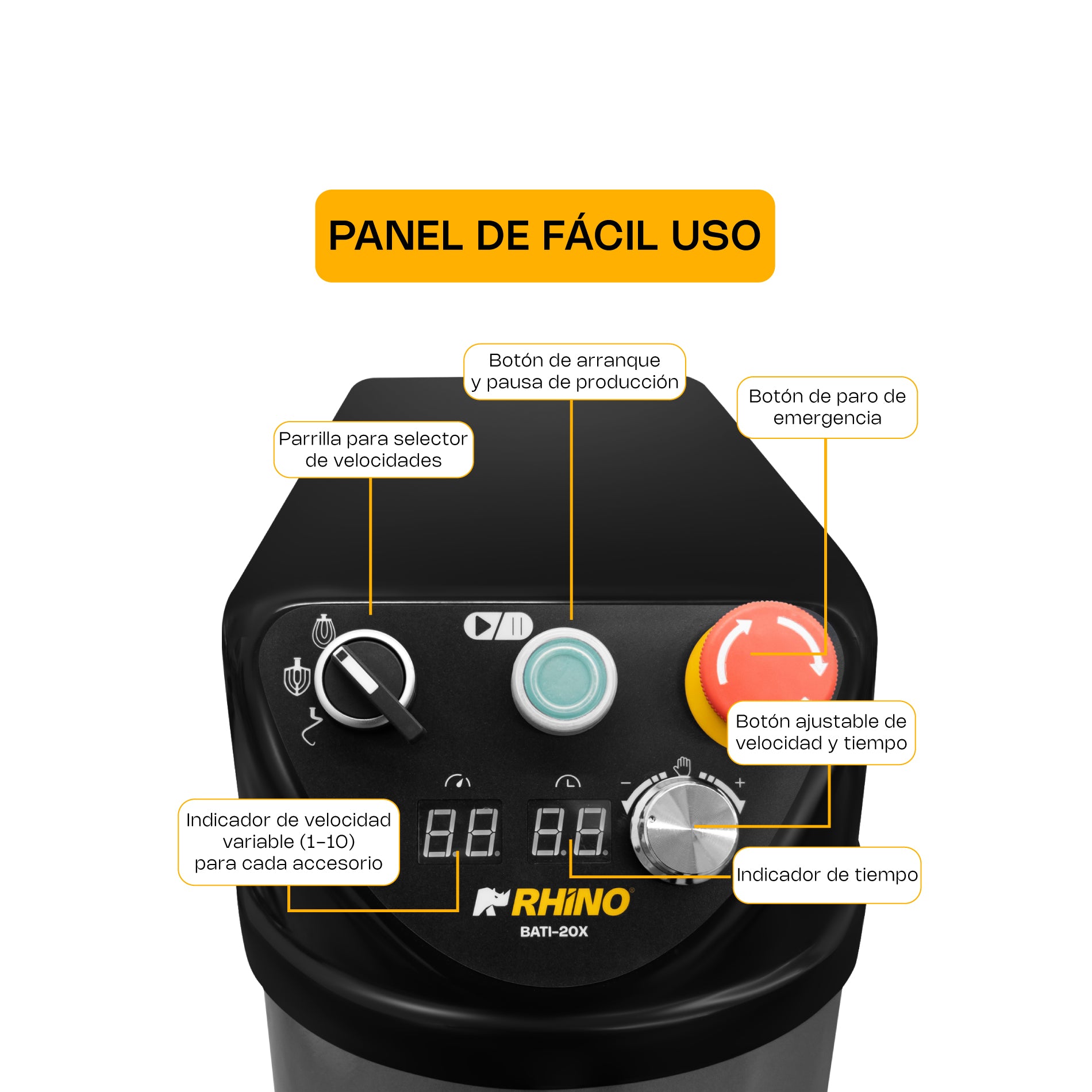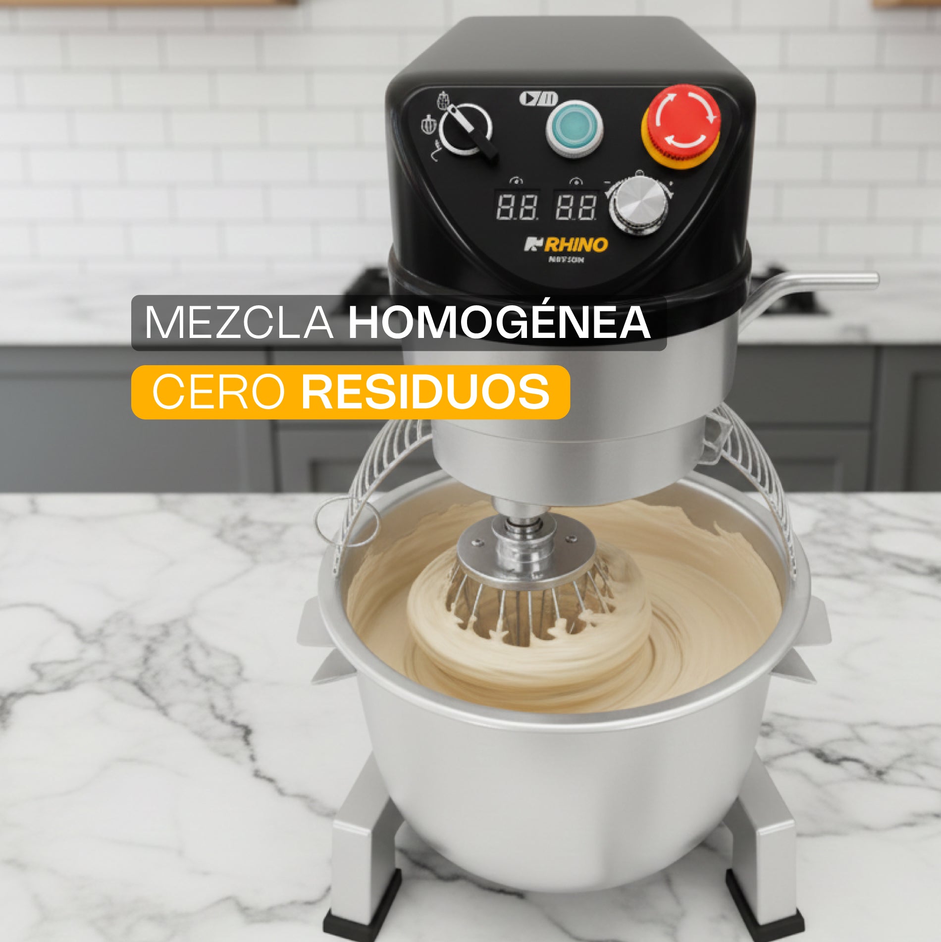- La batidora planetaria BATI-20X de Rhino es la elección ideal para profesionales que buscan un equipo de alto rendimiento con control total sobre el proceso de mezclado, proporcionando eficiencia y resultados consistentes en cada uso.