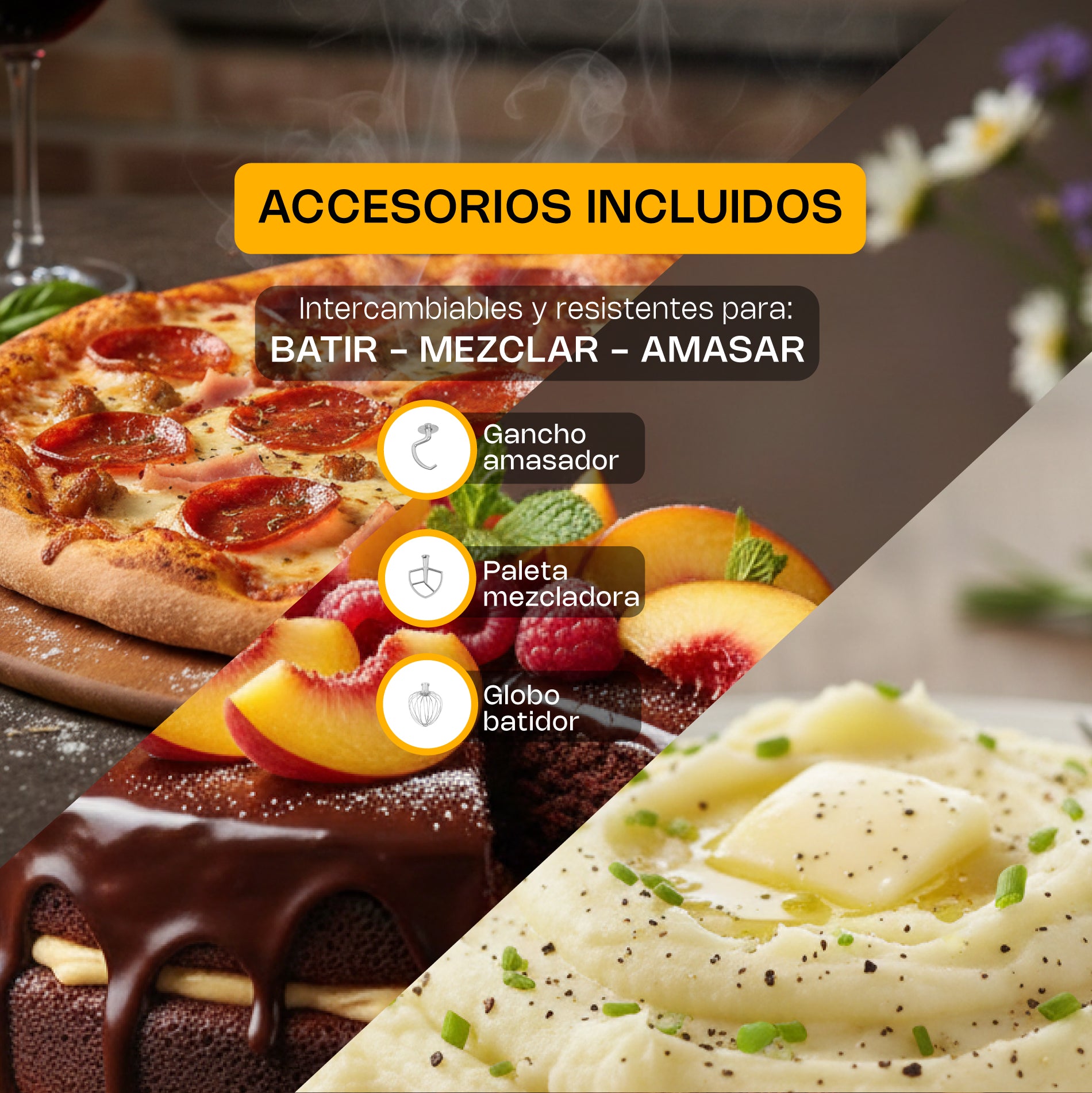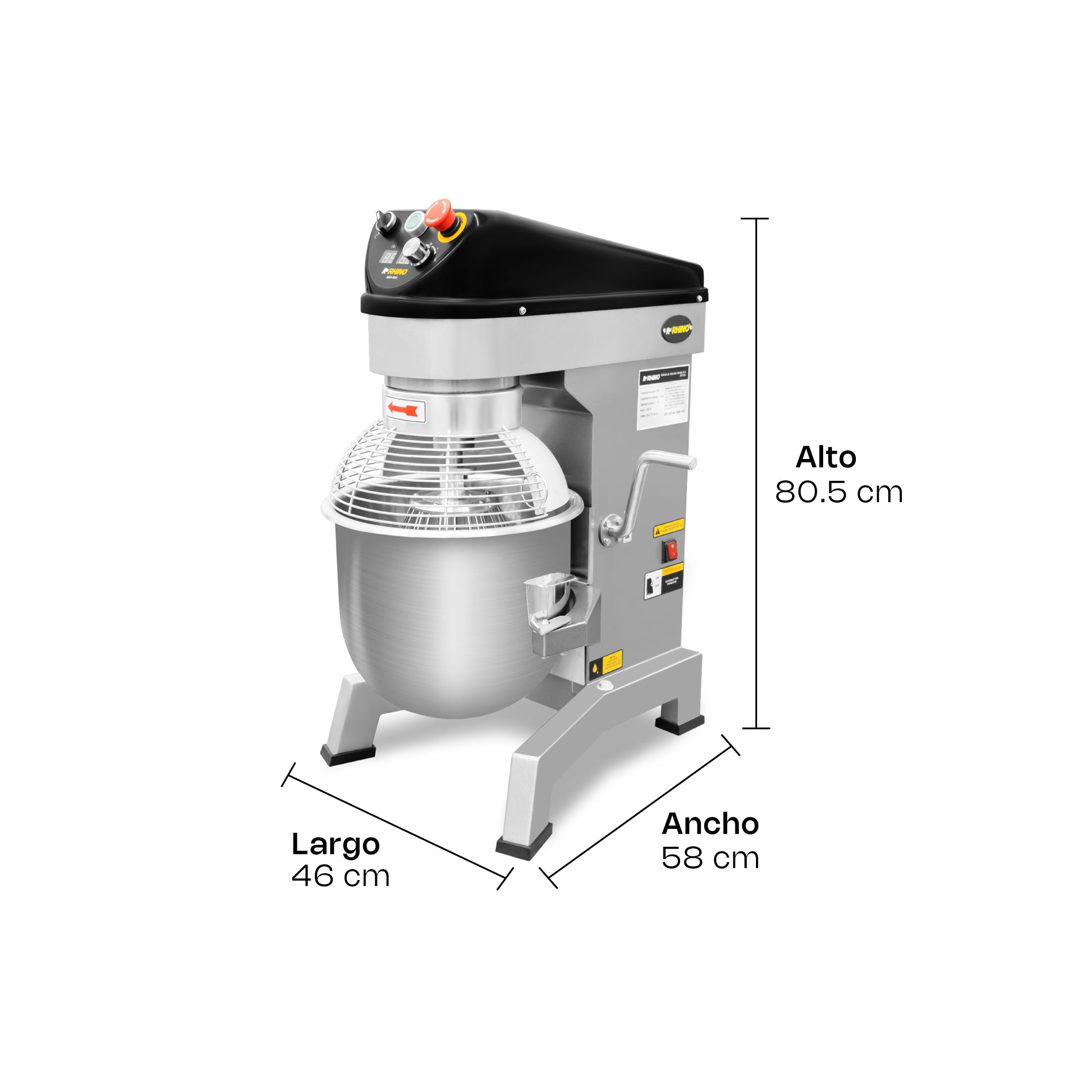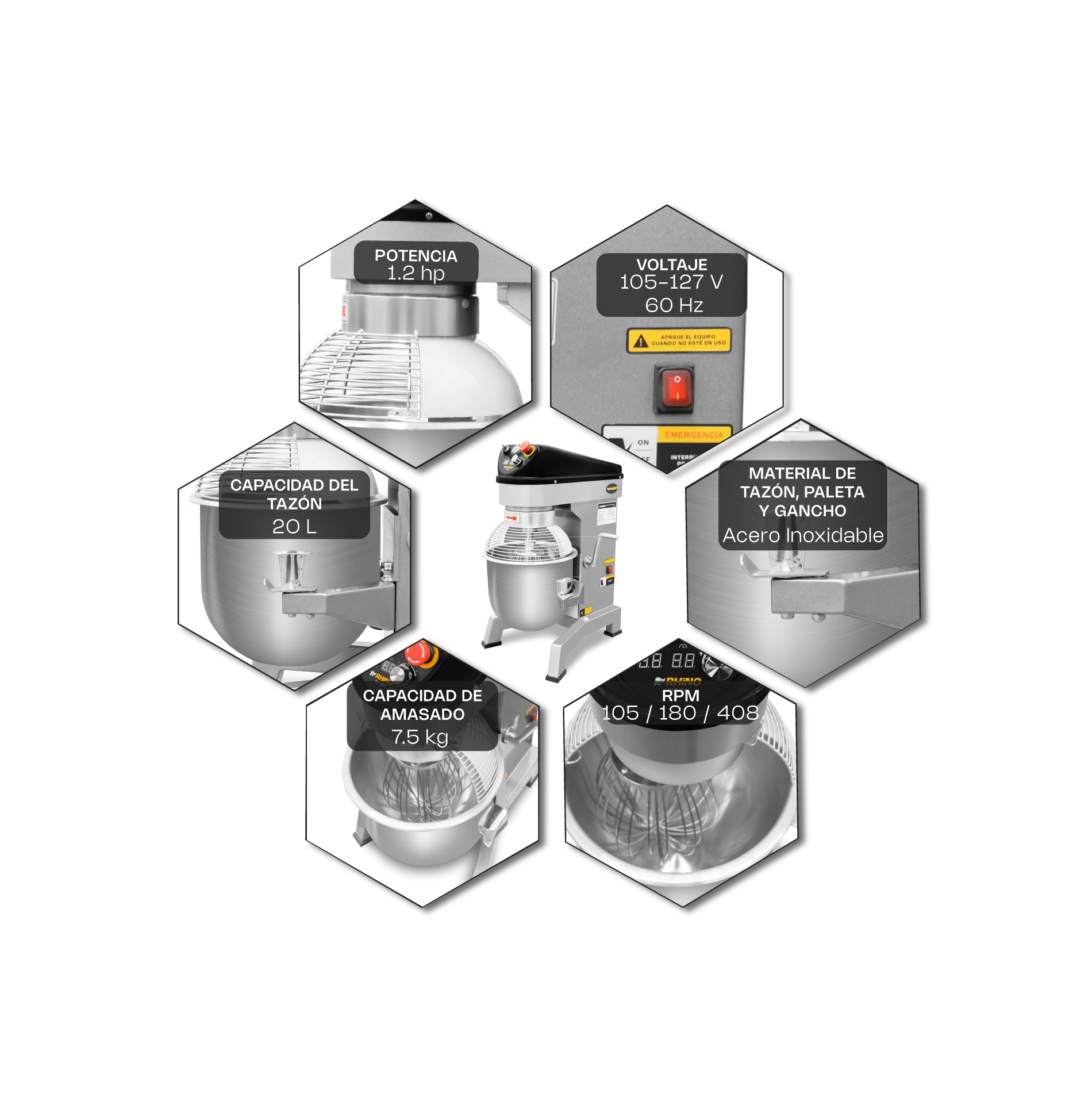 La batidora incluye tres accesorios intercambiables (paleta mezcladora, globo batidor y gancho amasador) fabricados en acero inoxidable, lo que asegura durabilidad y fácil limpieza. Su diseño con velocidad variable permite seleccionar la velocidad de mezcla ideal según las necesidades específicas de cada receta, lo que la hace ideal para una amplia gama de aplicaciones en panaderías, pastelerías, restaurantes y cocinas industriales.