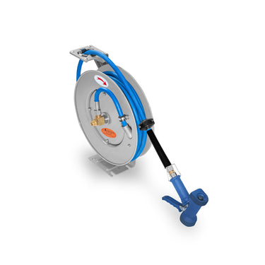 Cuenta con un sistema de carrete retráctil automático que permite retraer la manguera de manera suave, segura y controlada, reduciendo el desgaste y mejorando la organización del área de trabajo. Su sistema de bloqueo seguro permite ajustar la longitud necesaria durante el uso, brindando mayor comodidad y control.