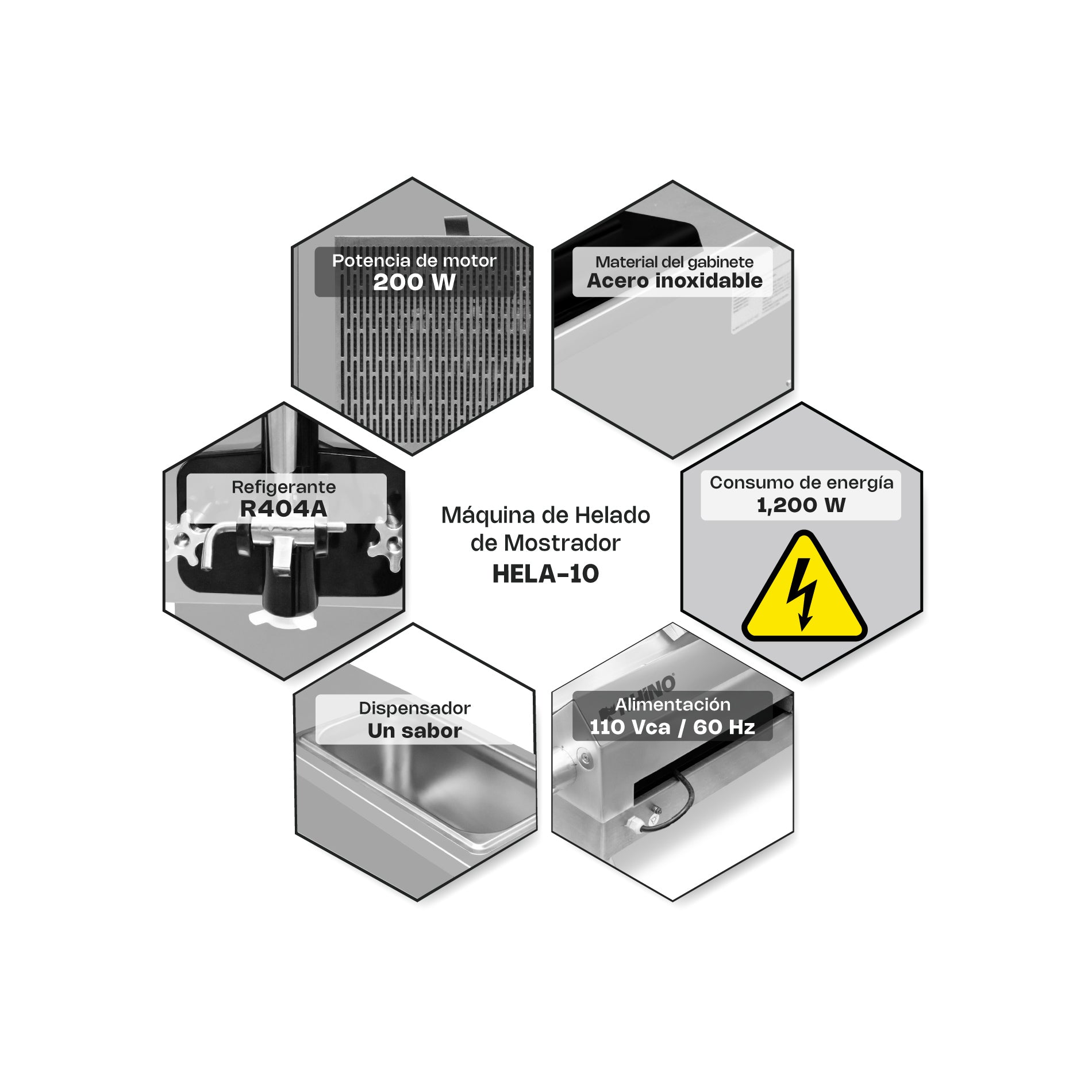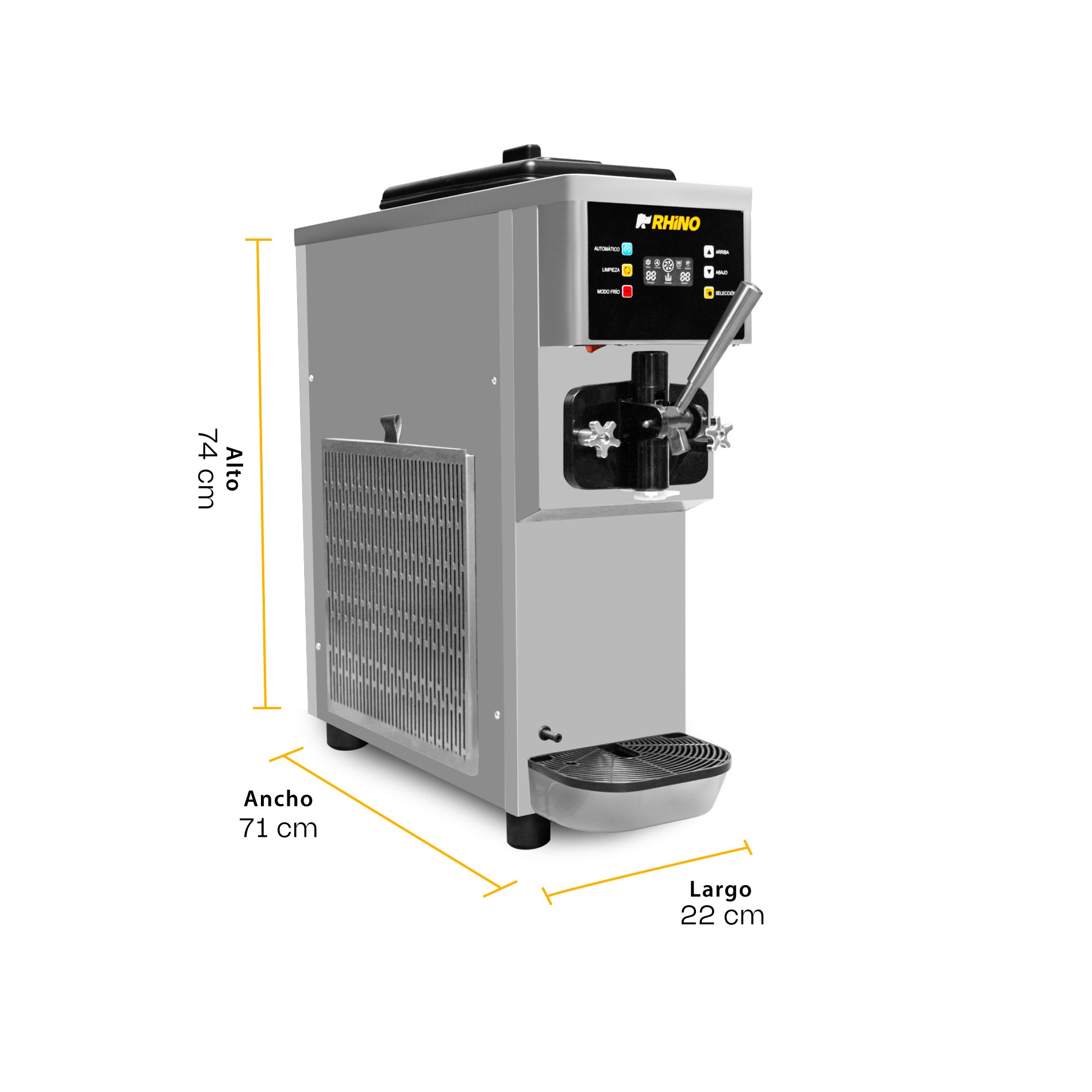 La máquina de helados HELA-10 de Rhino ofrece un diseño compacto de mostrador que maximiza el uso del espacio, siendo ideal para cafeterías, restaurantes o negocios pequeños que deseen ofrecer helado sin necesidad de equipos voluminosos. Produce entre 10 litros por hora, lo que permite atender una demanda media de forma eficiente.