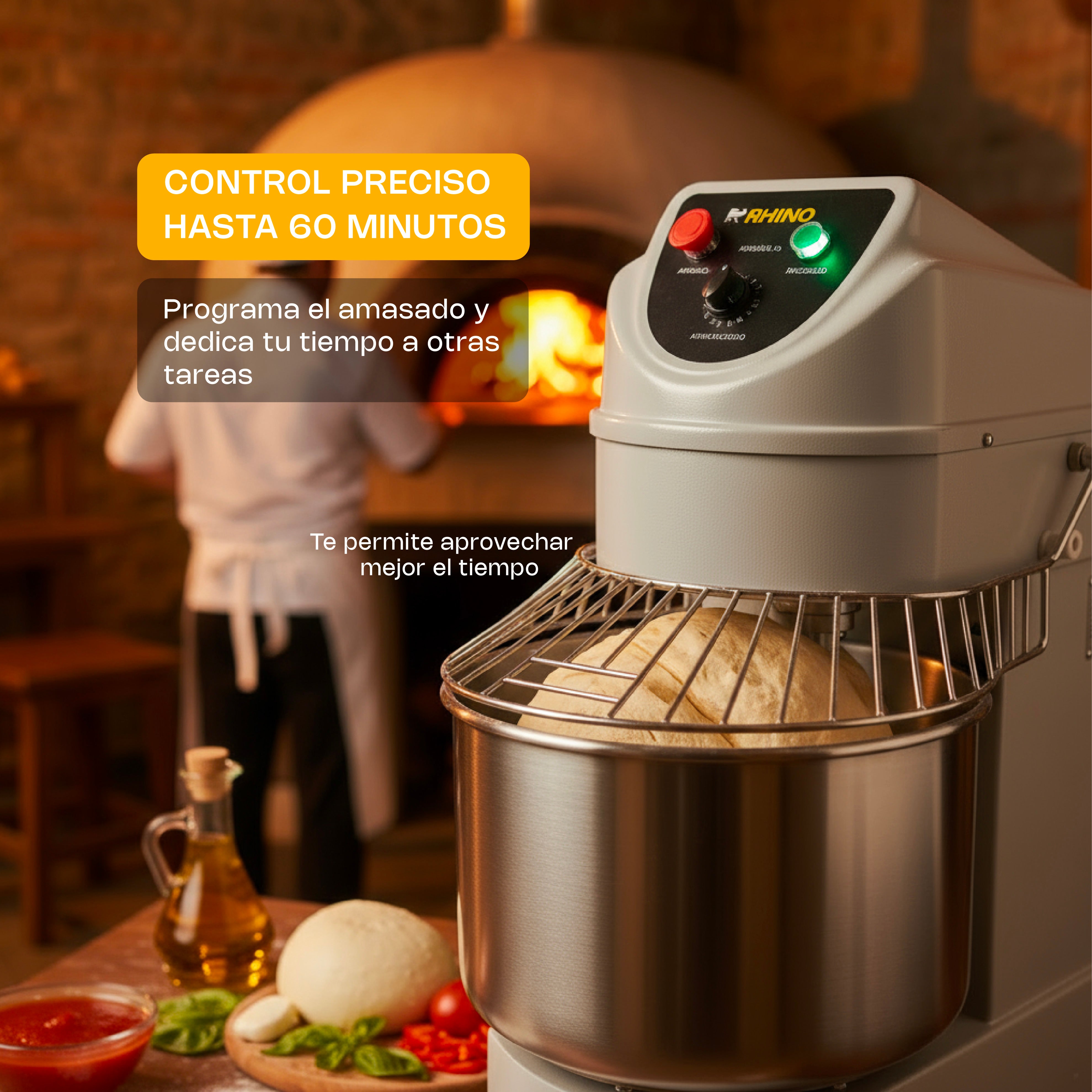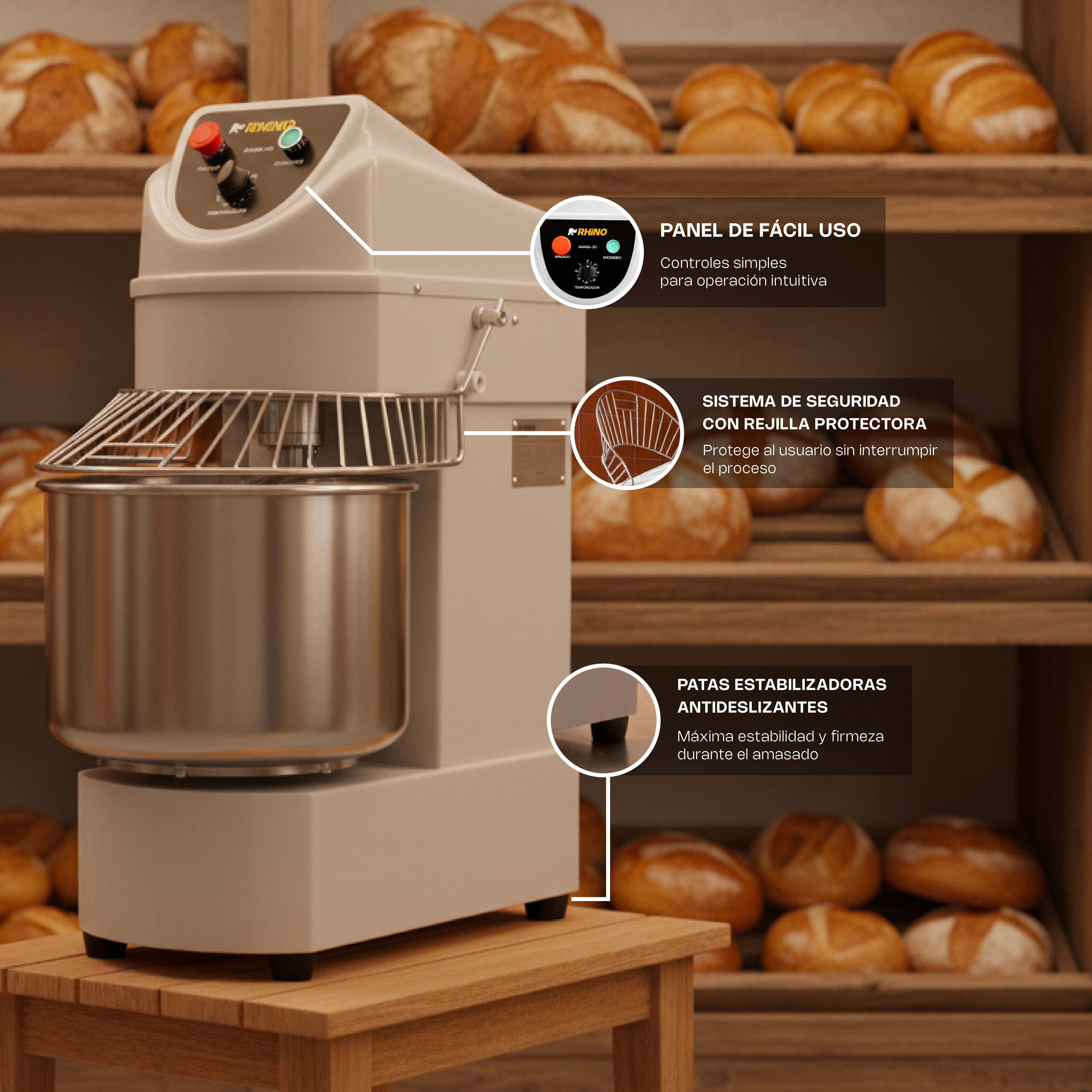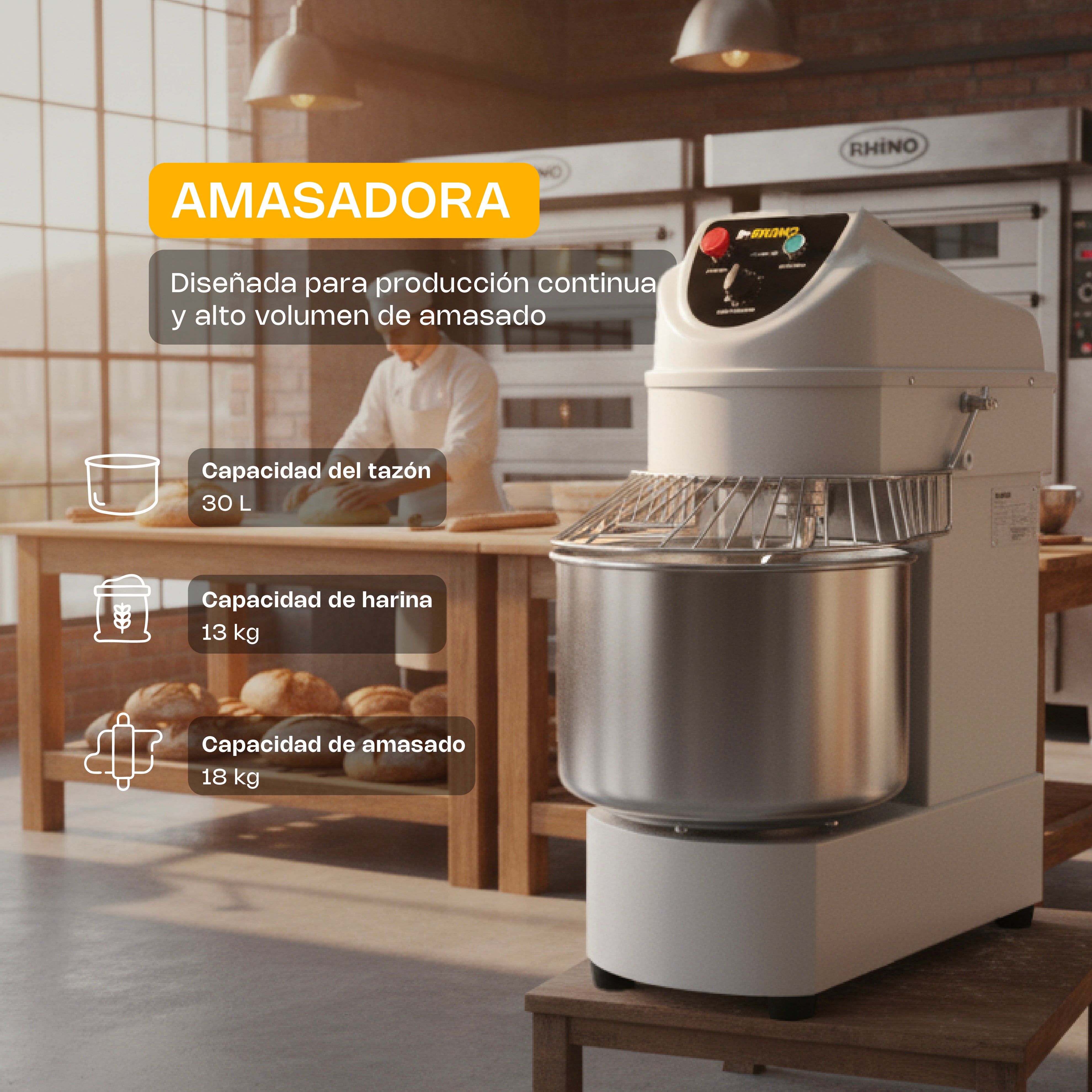 La amasadora AMASA-30 de Rhino está diseñada para ofrecer potencia, eficiencia y uniformidad en cada mezcla. Con un motor de 1,500 W, es capaz de trabajar mezclas densas de hasta 18 kg sin pérdida de rendimiento, ideal para panaderías, reposterías y negocios que requieren producción continua.