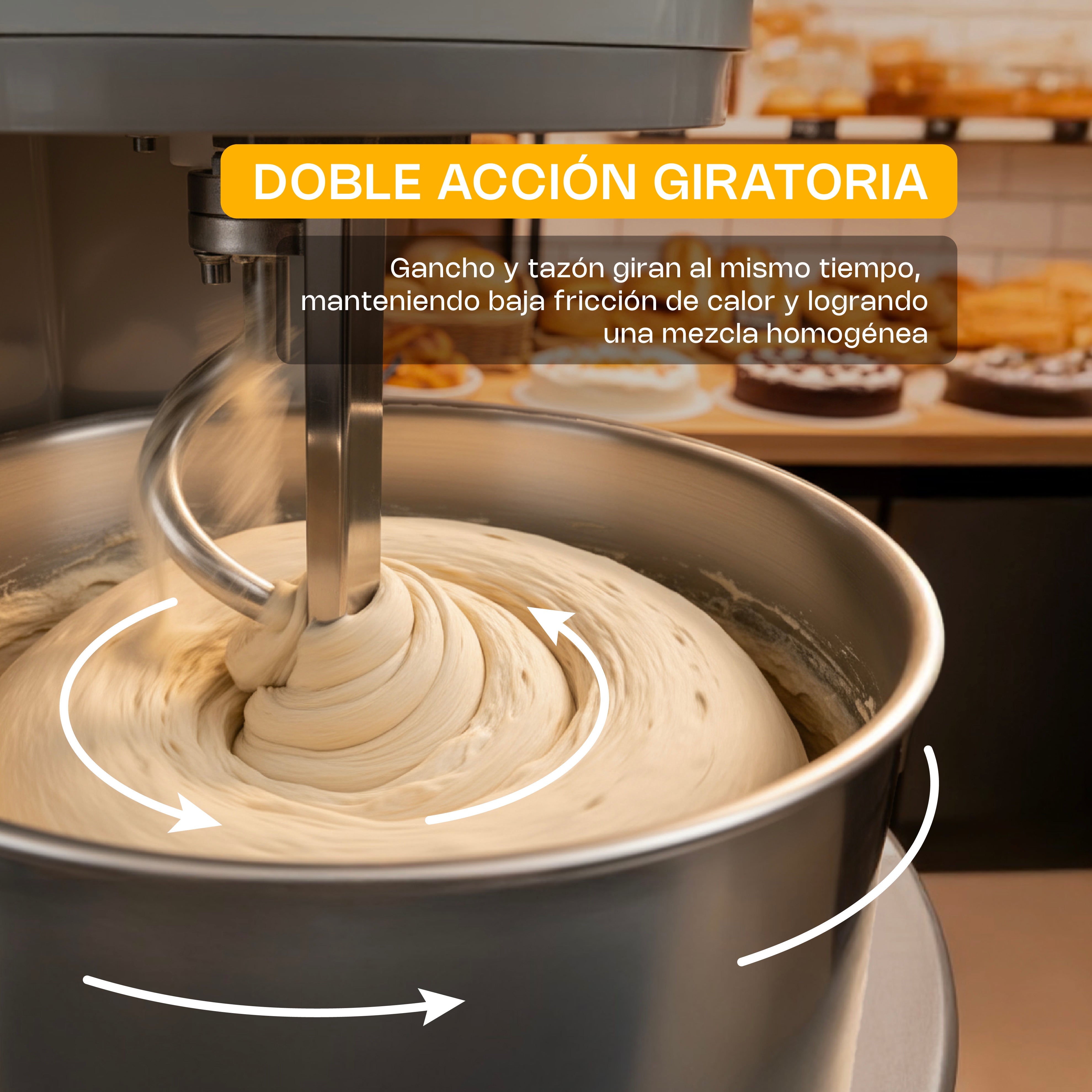 Su sistema de doble acción giratoria permite que el gancho y el tazón giren simultáneamente, reduciendo la fricción del calor y logrando una masa más homogénea y aireada. Incluye un sistema de seguridad con rejilla protectora que evita el contacto directo con el área de trabajo durante la operación.