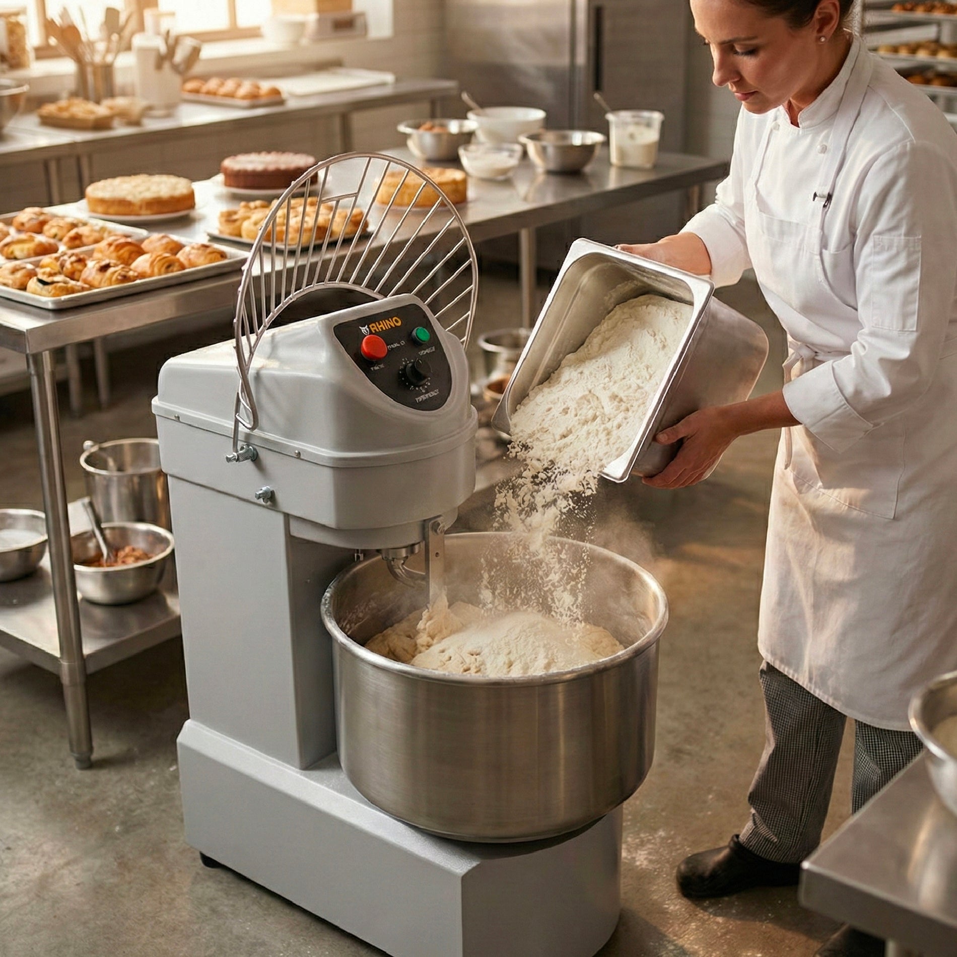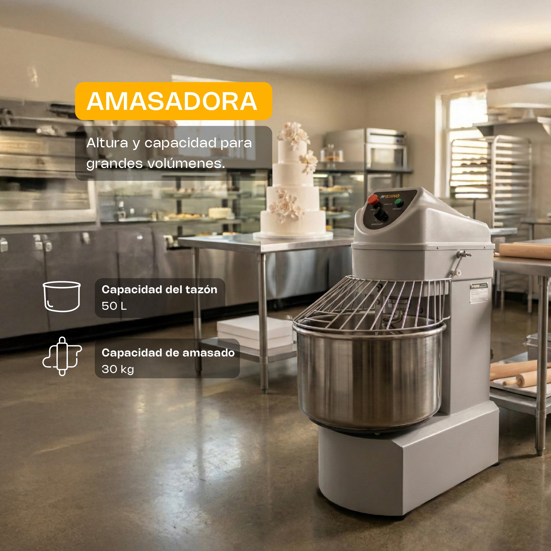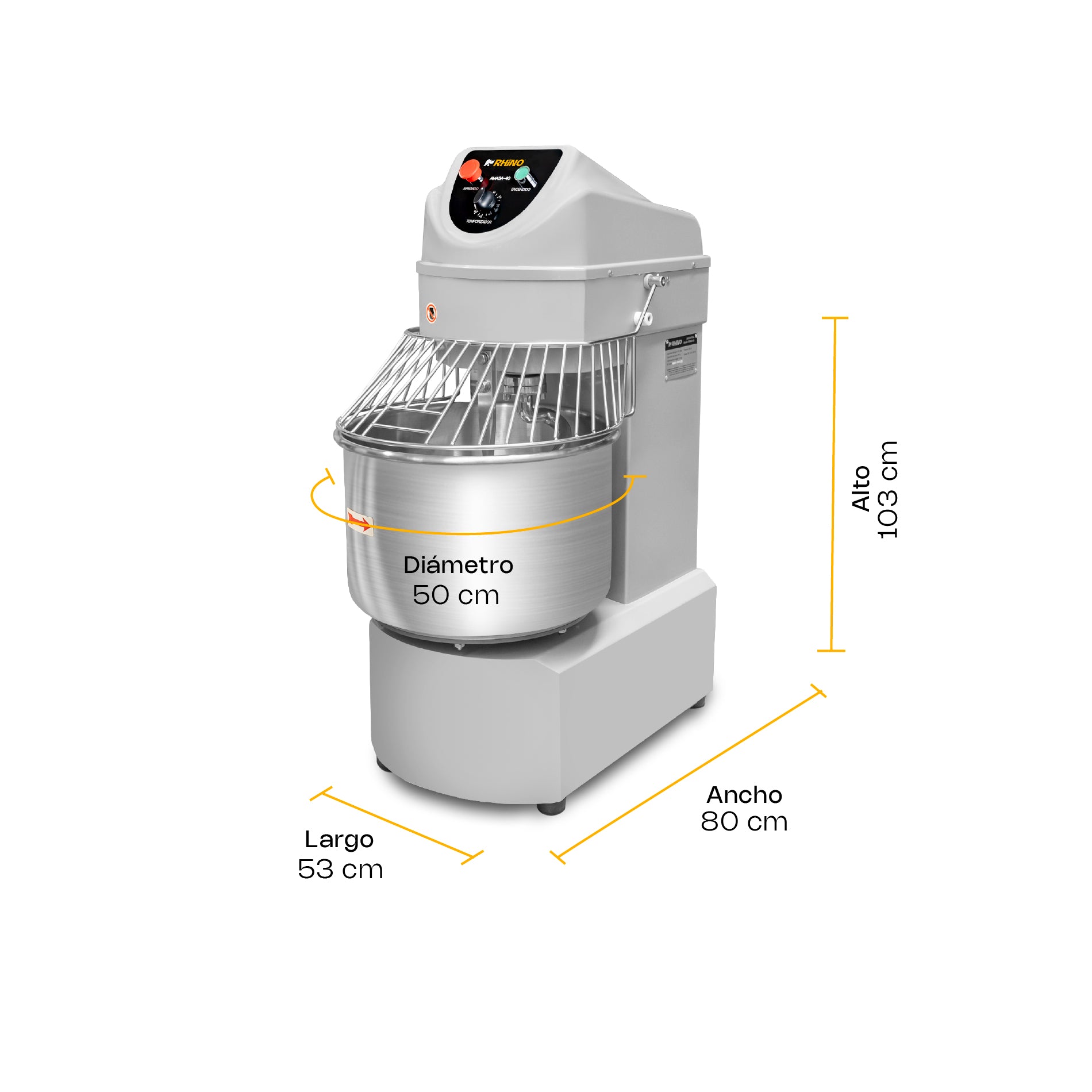 - La amasadora AMASA-50 de Rhino es la solución perfecta para negocios que requieren una máquina potente y confiable para el amasado de grandes volúmenes de masa, asegurando eficiencia, calidad y seguridad en cada uso.