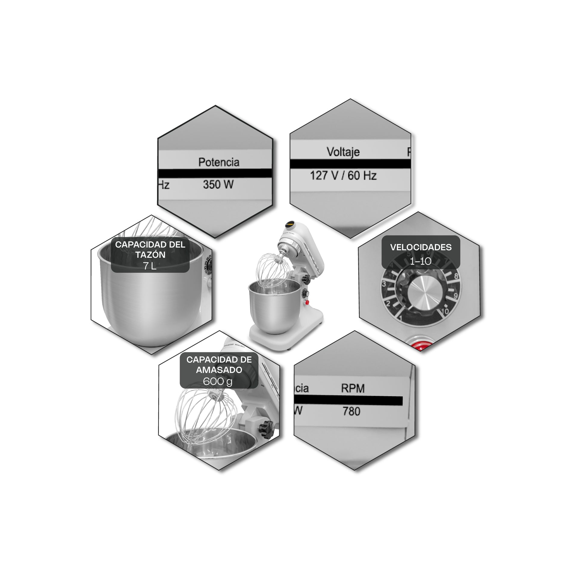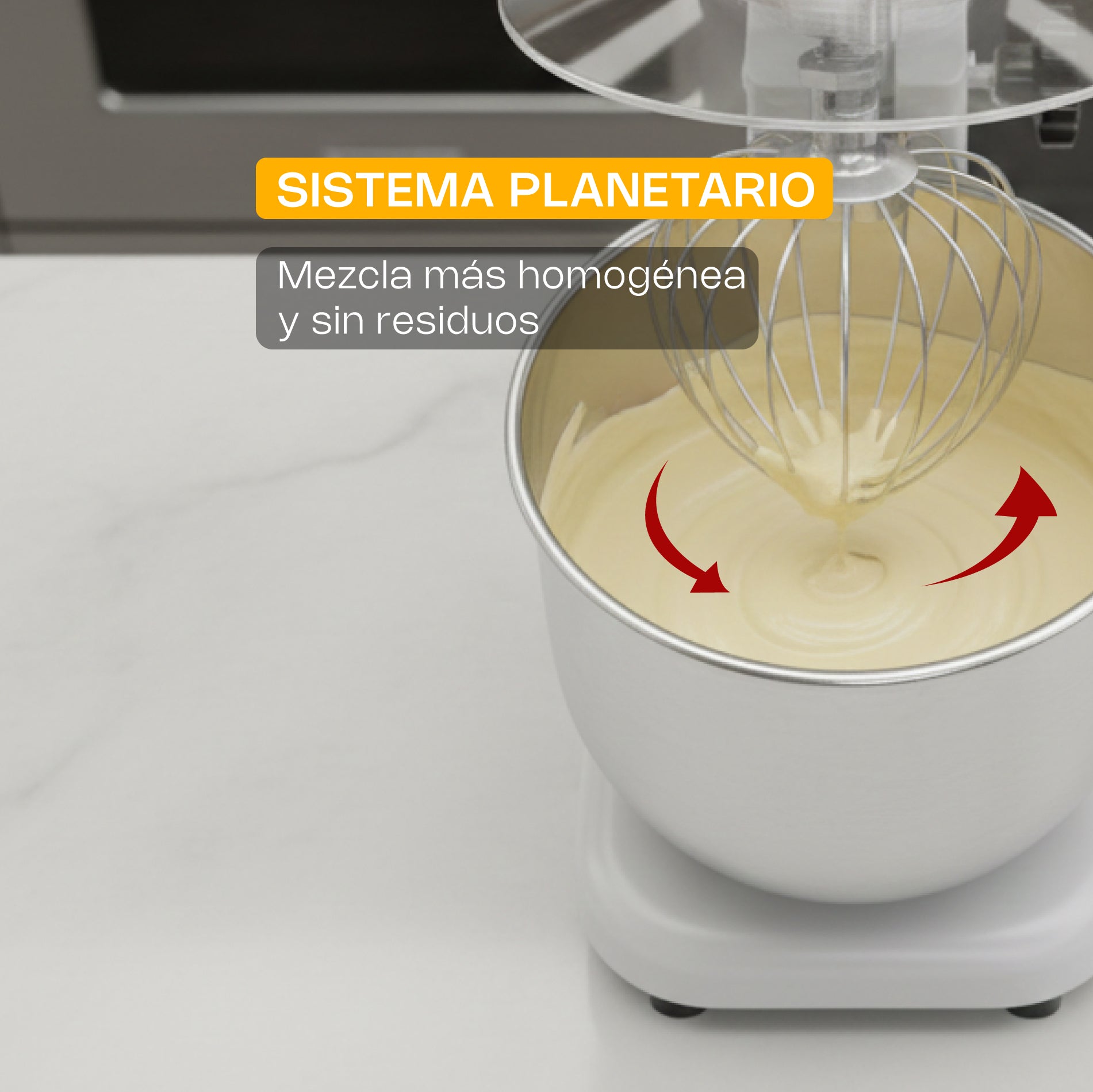 - Capacidad de hasta 7 litros, superior a otras batidoras de menor capacidad.Â
