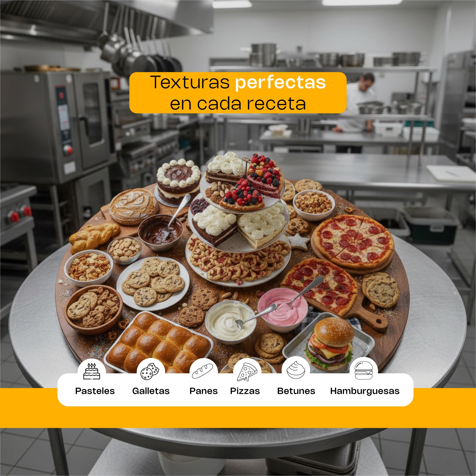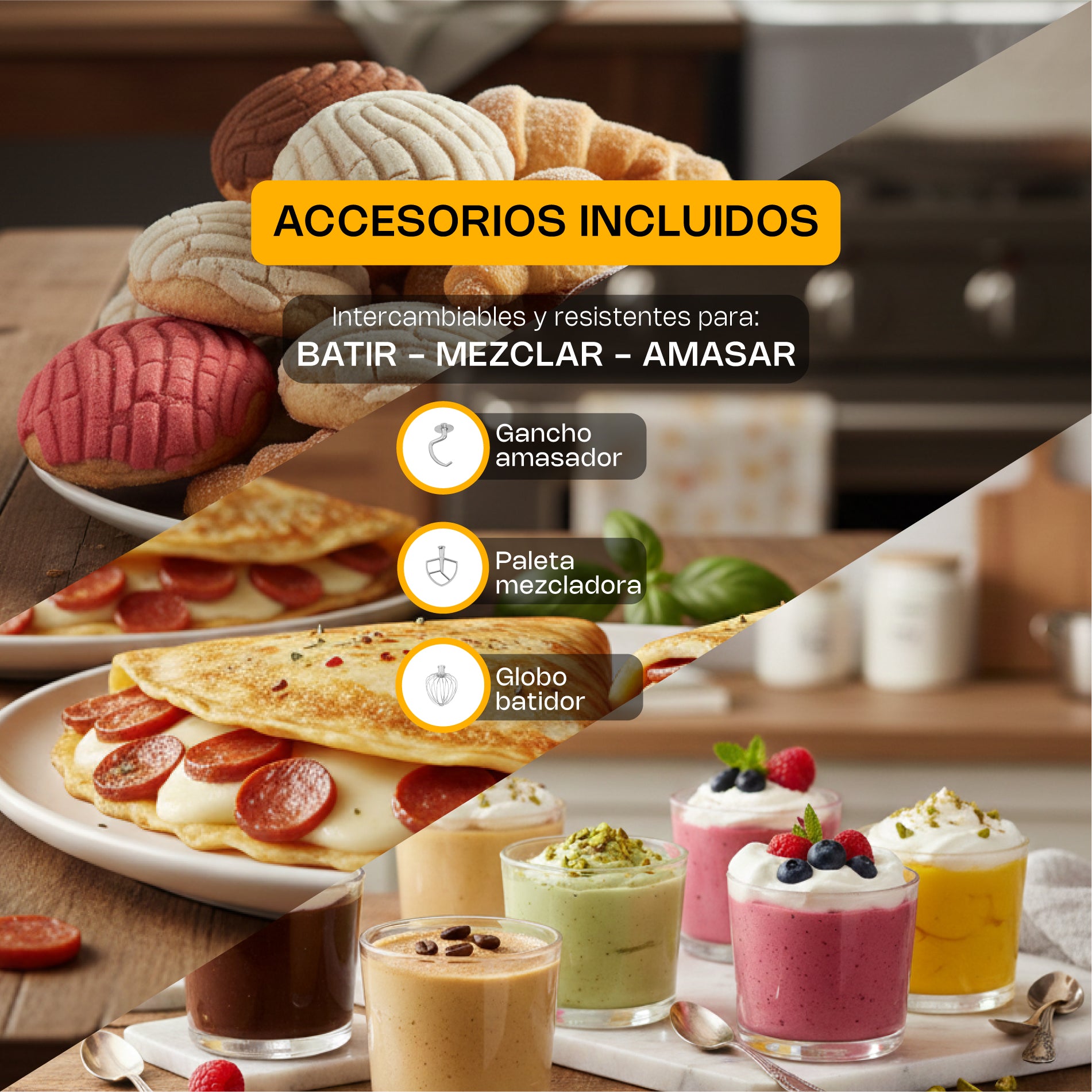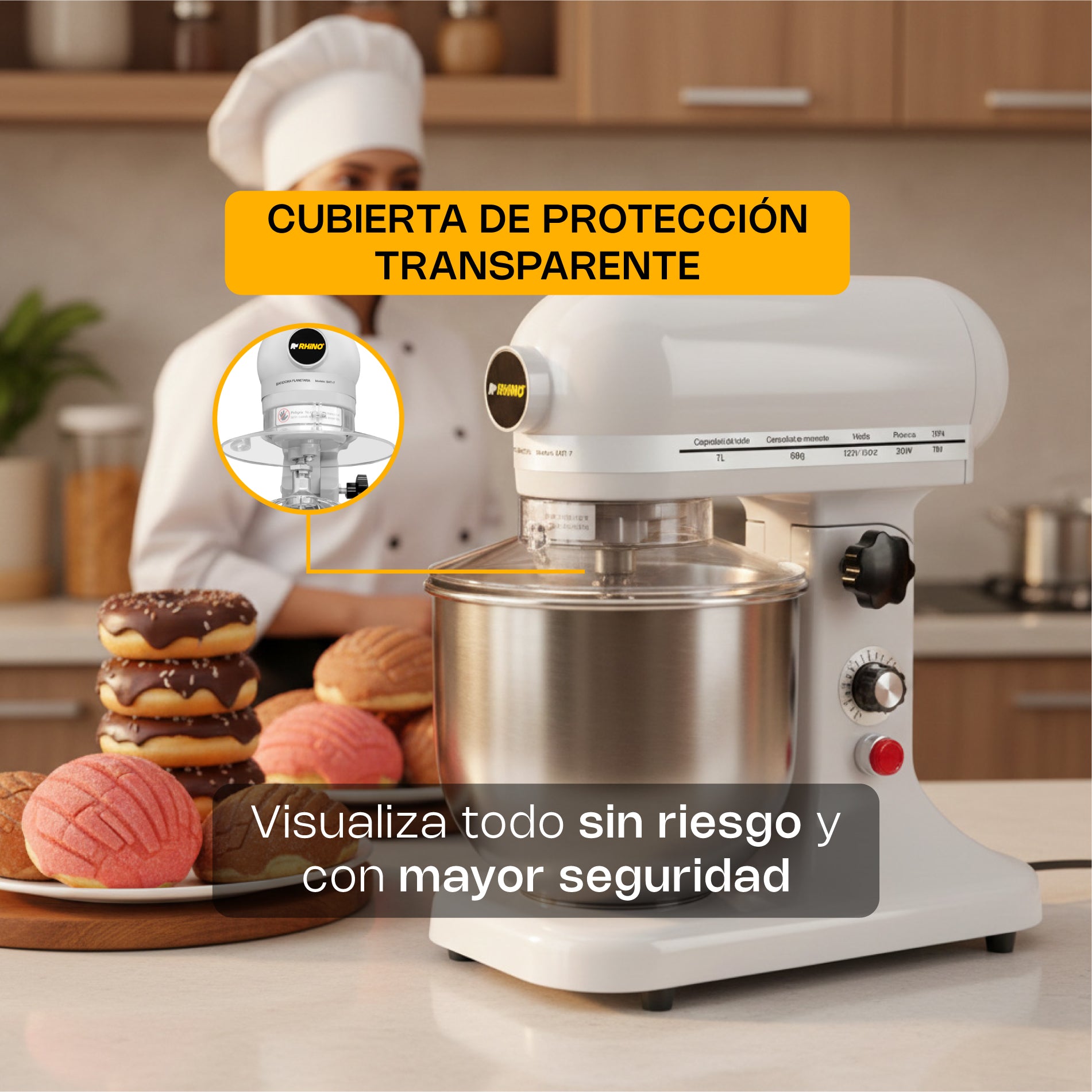 Multifuncional y versátil, la BATI-7 incluye tres accesorios intercambiables (gancho amasador, paleta mezcladora y globo batidor), adaptándose a diferentes necesidades de mezcla. Su diseño compacto no compromete la seguridad, ya que cuenta con una cubierta transparente de protección, permitiendo visualizar los ingredientes de manera segura durante el uso.