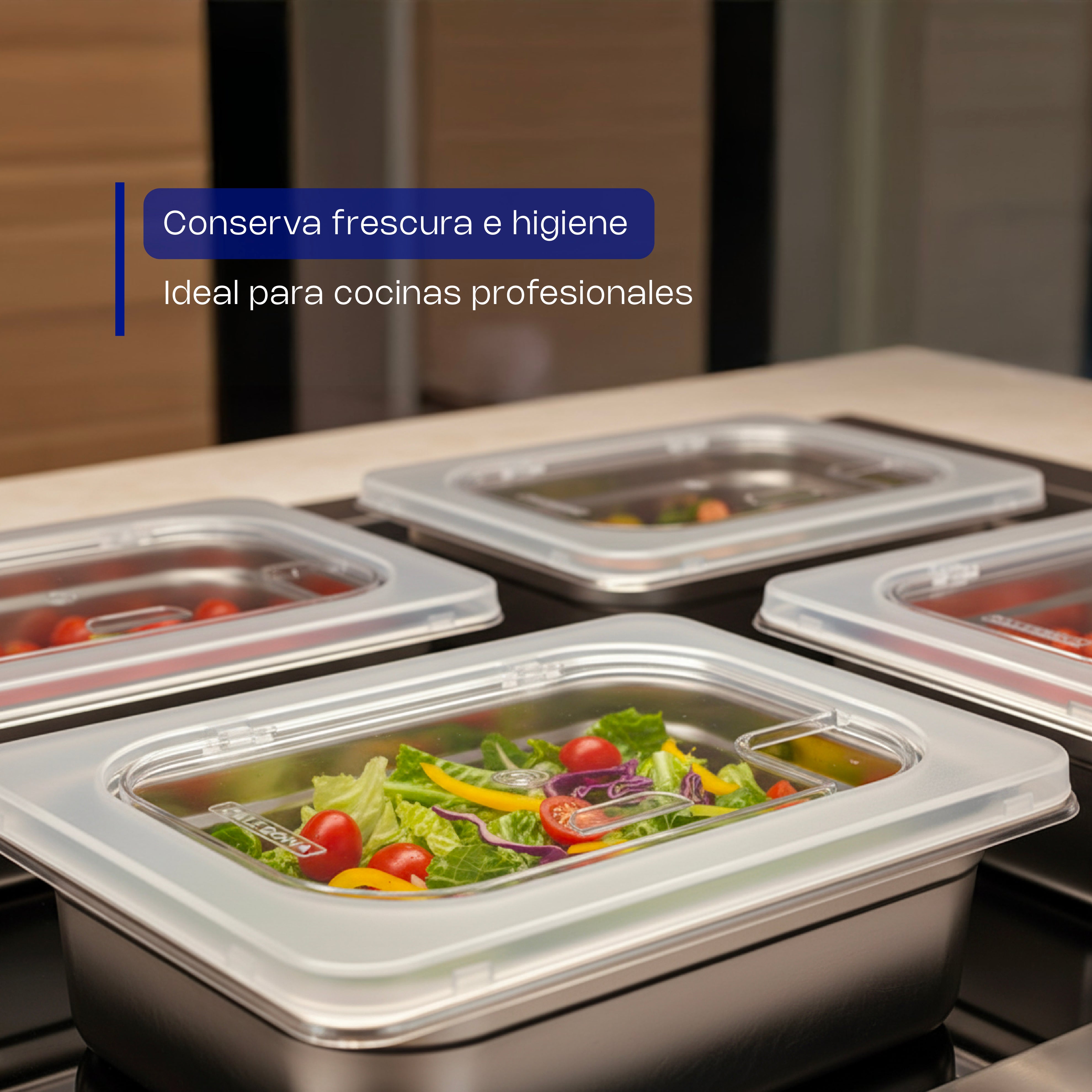 Cuentan con un orificio para cuchara que permite mantener el utensilio dentro del inserto sin comprometer la higiene ni la funcionalidad. Están especialmente diseñadas para insertos de tamaño noveno, garantizando un ajuste preciso con equipos estándar de cocinas profesionales, buffets y comedores institucionales.